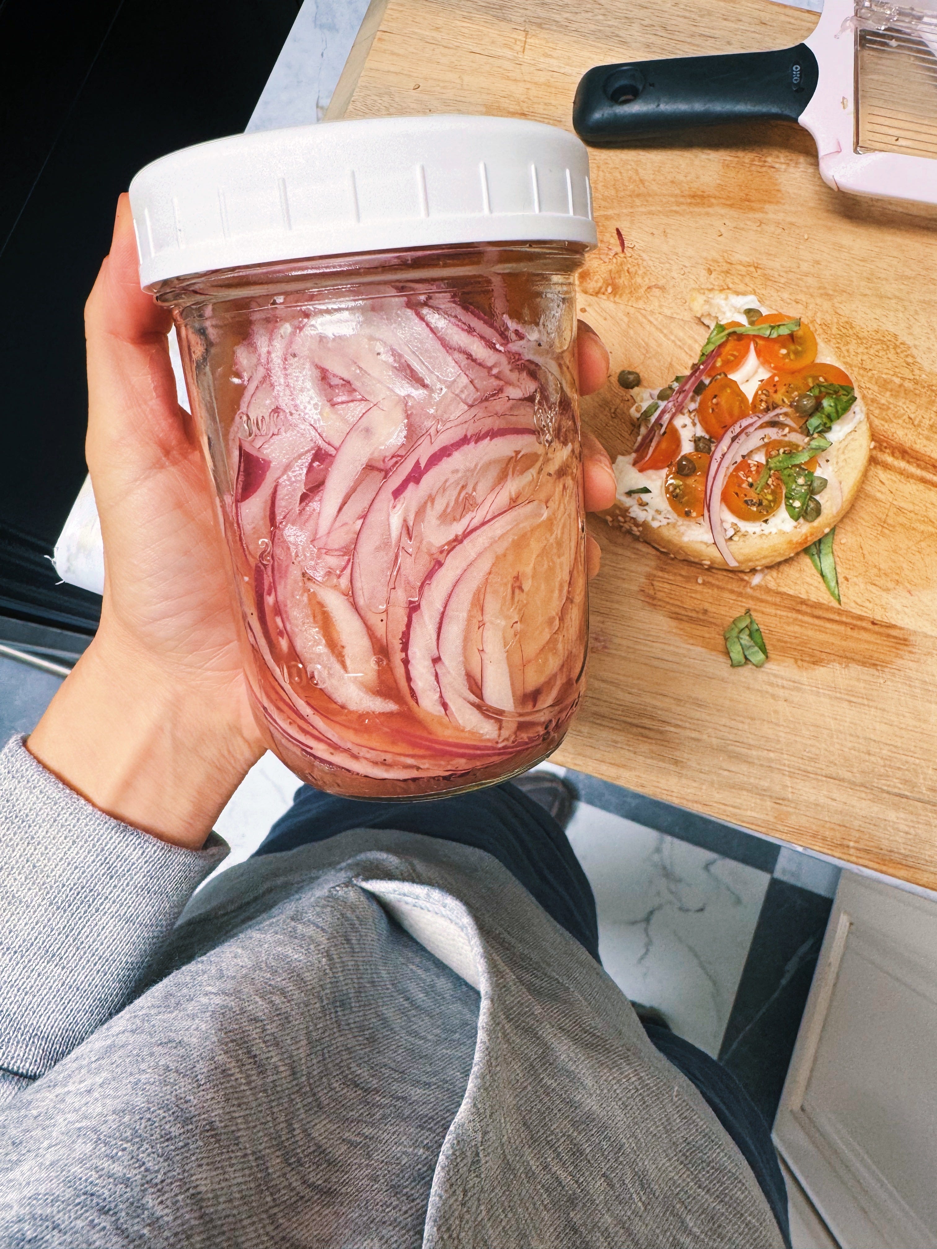 Only needed a few slices of red onion for my bagel, so did a quick pickle using the rest! Just six ingredients (onion, ACV, lemon, salt, peppercorns, garlic) and ready in 24 hours. Just like store-bought - all the flavor but a fraction of the price and zero sugar ๐.